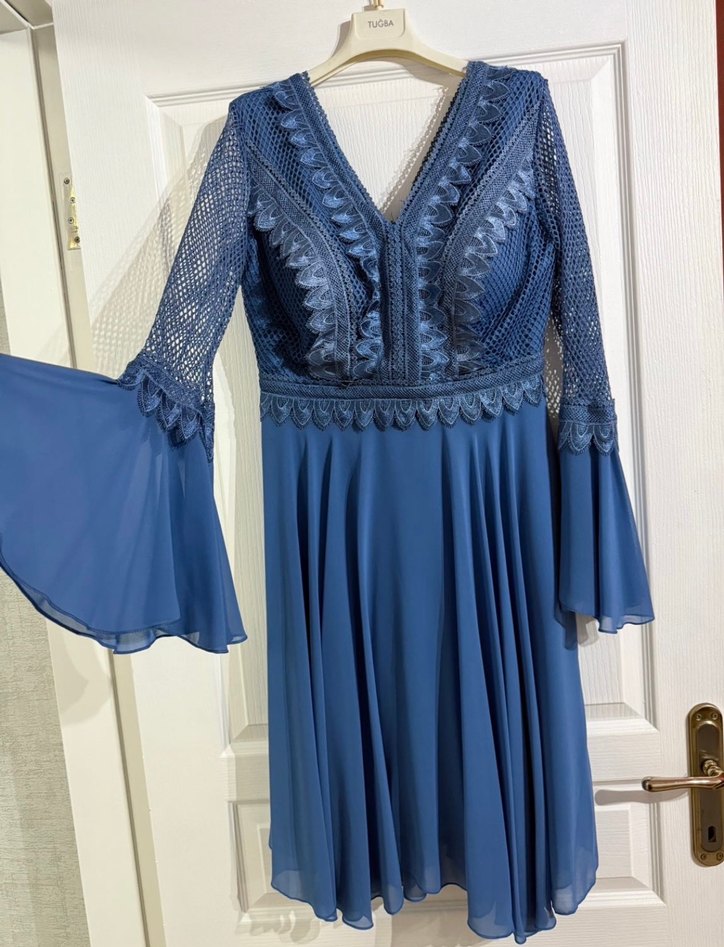 Uzun kollu, V yakalı mavi gece elbisesi dantel ve işlemeli detaylara sahiptir. Salaş kesimi ve bohem tarzı ile düğünler için uygundur.
