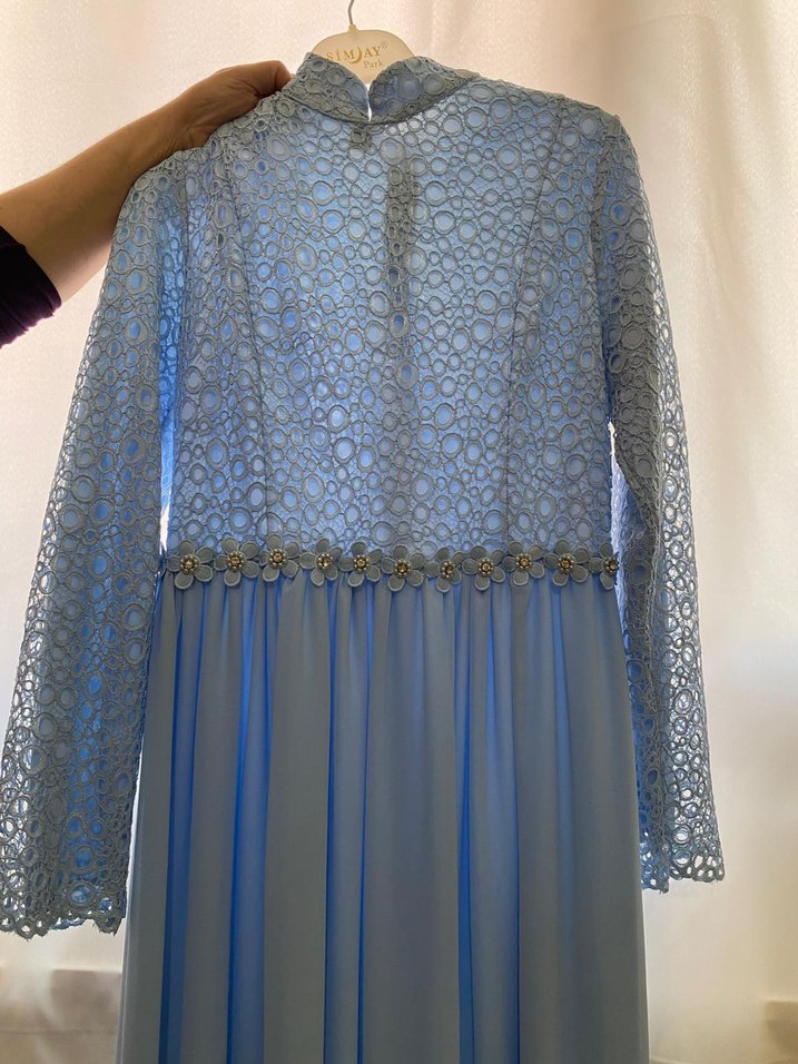 Uzun kollu ve yüksek yakalı mavi dantel üst kısmı olan bu uzun abiye elbise, belde çiçekli kemer detayıyla vintage bohem şıklığı sunar. Etek kısmı dökümlü kumaştan yapılmıştır.