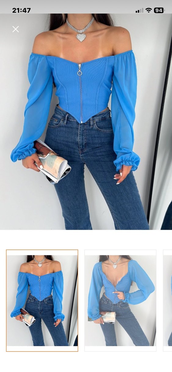 Fermuarlı, V yakalı ve uzun şeffaf kollu, fitted mavi denim crop bluz. Baskılı desenli, kısa boylu ve günlük sokak tarzına uygun.