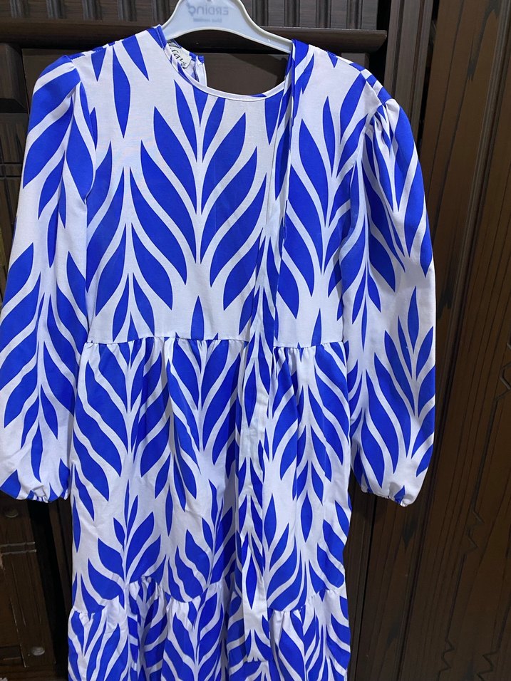 Uzun kollu, V yakalı, mavi-beyaz desenli sentetik kumaştan yapılmış bol kesim elbise. Pliseli detaylara sahip bohem tarzda, günlük kullanıma uygun.