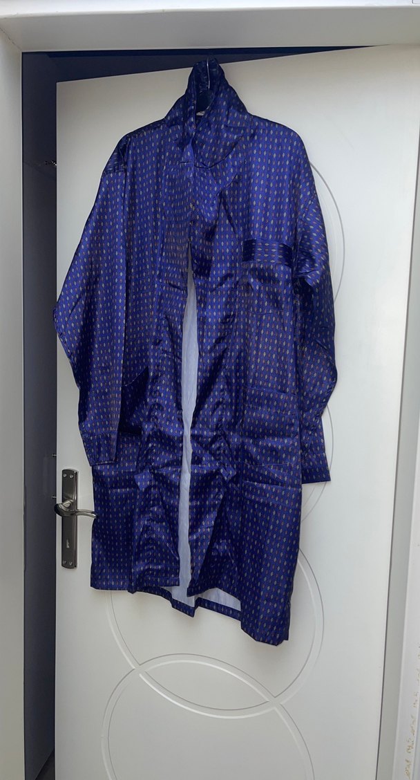 Uzun kollu, regular fit erkek pijama takımı, yakalı ve drapeli tasarıma sahip. Parlak mavi tie-dye desenli, geleneksel ve şık bir modeldir.