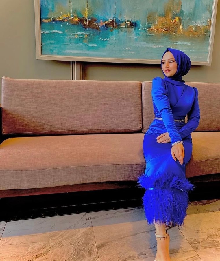 Uzun kollu, tekne yaka, drapeli ve etnik desenli mavi abiye elbise. Parlak kumaş ve tüylü etek ucu ile şık bir görünüm sunar.