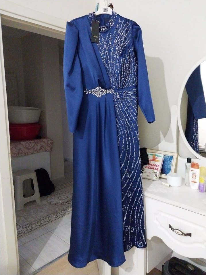 Uzun kollu, drapeli ve parlak desenli mavi abiye elbise, klasik ve modern tarzı bir araya getirir. Düğün için ideal, regular fit ve yakasında kesik yaka bulunur.
