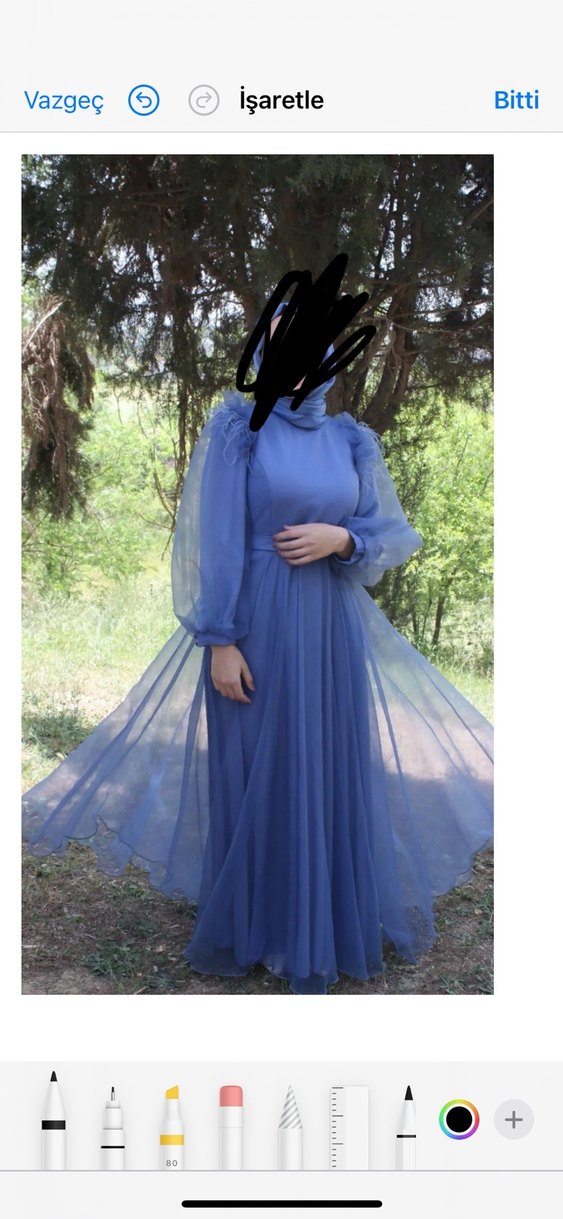 Yüksek yakalı ve uzun kollu, drapeli detaylara sahip uzun mavi abiye elbise. Bol kesimli, modern klasik stil, kemerli omuz detaylarında tüyleri olan elbise hiçbir problemi yok elbisenin