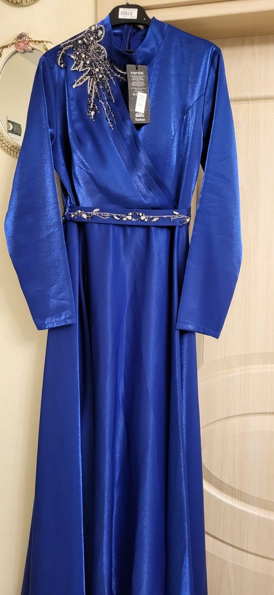 Uzun kollu, V yakalı mavi abiye elbise, drapeli tasarımı ve parlak dokusuyla düğünler için uygundur. Klasik ve şık bir görünüm sunar. hiç giyilmedi