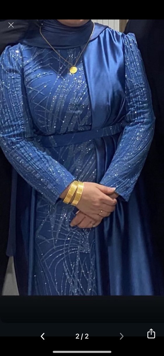 Parlak mavi, drapeli uzun kollu ve yakalı, desenli, dar kesim abiye elbise. Düğünler için uygun şık tasarım. ✨