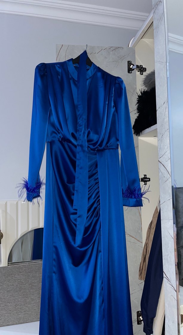 Uzun Kollu Mavi Drapeli Kadın Abiye Elbise