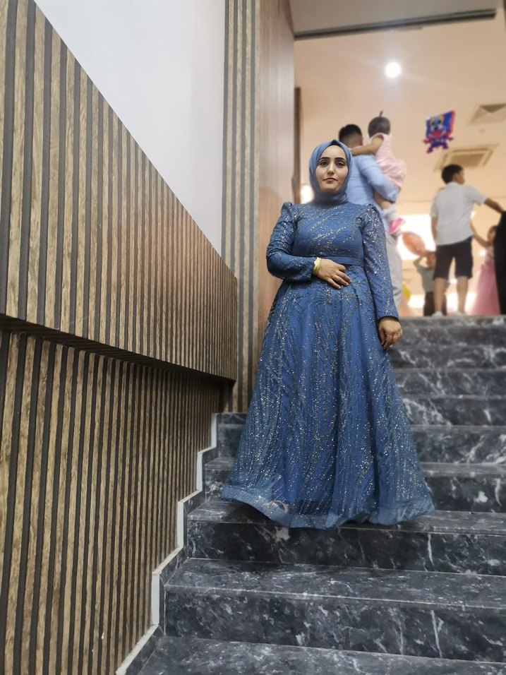 Uzun kollu, yüksek yakalı mavi abiye, etnik desenli ve drapeli tasarımıyla tesettürlü, gösterişli ve konvansiyonel bir görünüme sahiptir. Şal da dahil