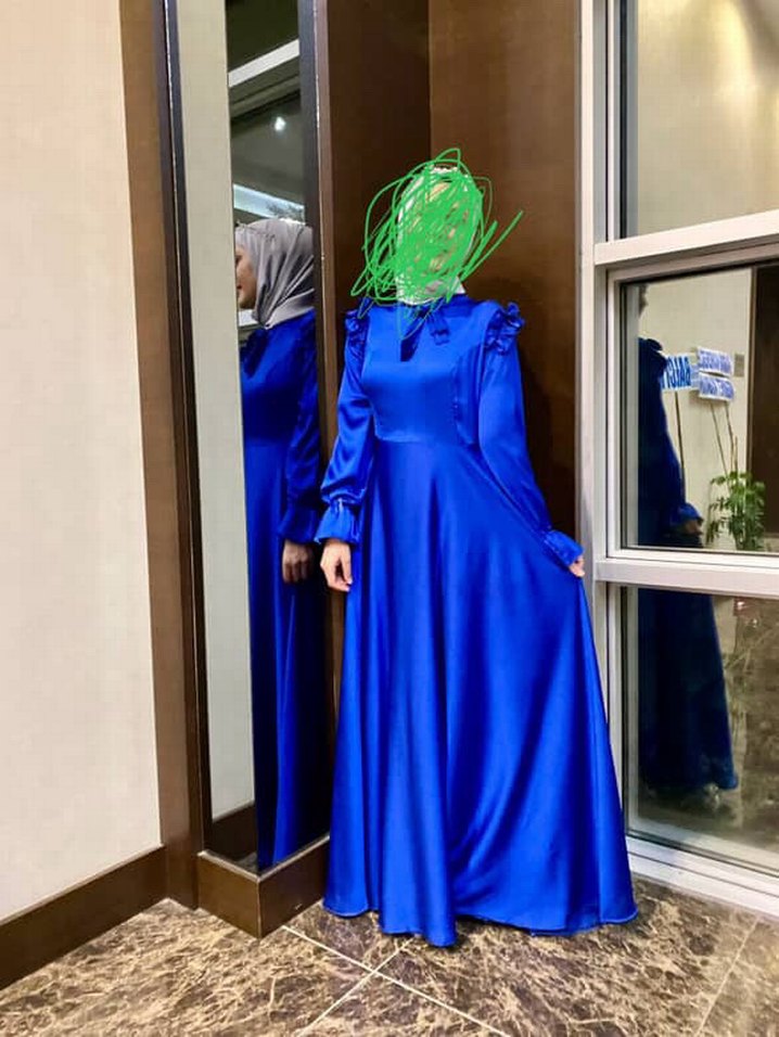 Uzun kollu, yüksek yakalı, bol kesim mavi abiye. Drapeli detaylar ve parlak batik desen içerir, düğünler için uygundur.
