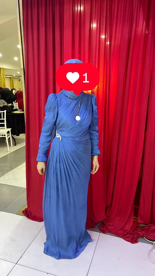 Bu mavi uzun abiye elbise, yüksek yakalı ve drapeli tasarıma sahiptir. Uzun kollu ve modest kesim, düğünler için uygundur. Şalla beraber gönderilecektir 38-40 beden uyumludur
