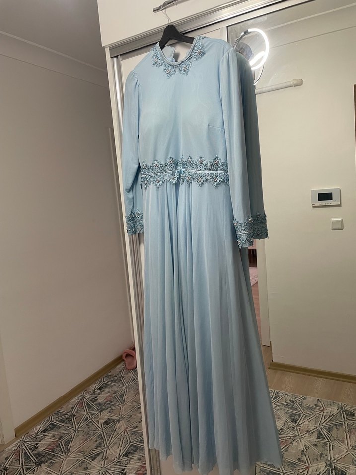 Pastel mavi renkte, yüksek yakalı ve uzun kollu vintage tarzda abiye elbise. Dantel detayları yakada, belde ve kollarda bulunur, bol kesim ve drapeli yapıya sahiptir.