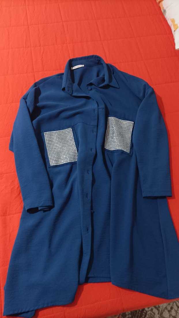 Uzun kollu, düğmeli, mavi sentetik kumaştan kadın gömleği. Notlu yakalı, bol kesim ve parlak cep detaylarına sahip, günlük sokak tarzı için uygun.38 beden ama 44 bedene kadar oluyor