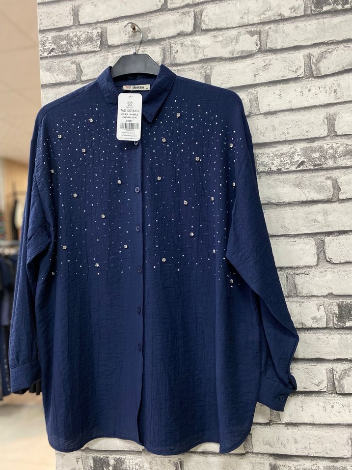 Uzun Kollu Mavi Düğmeli Kadın Gömlek
