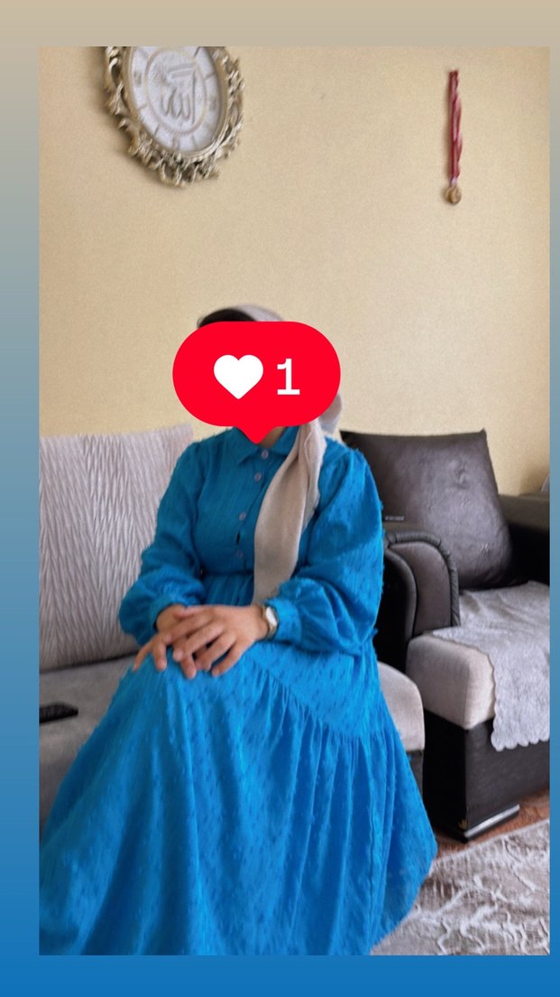 Halter yakalı, uzun kollu ve düğmeli uzun mavi elbise, bol kesim ve pastel tonlarda, baskılı desene sahip. 36 beden ama 40 bedene kadar da oluyor