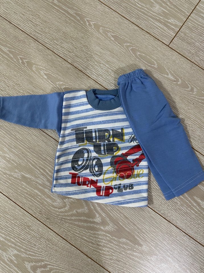 Uzun kollu, bisiklet yaka, renkli baskılı üst ve mavi örme pantolondan oluşan, yumuşak ve sıcak kumaşlı erkek bebek takımı.