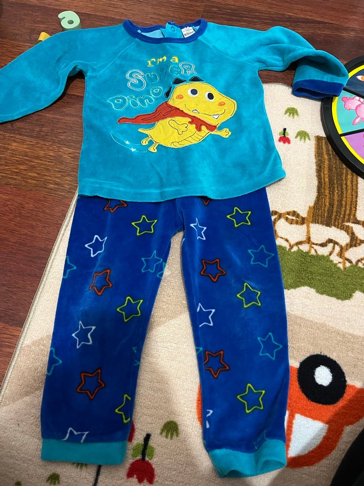 Renkli mavi, uzun kollu, baskılı dinozor desenli erkek bebek takımı. Yumuşak ve sıcak kumaştan, cırt cırtlı, M beden.