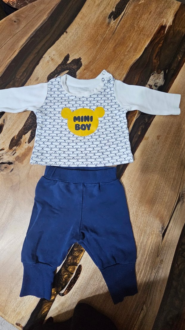 Uzun kollu, pamuklu, crew neck üstte "MINI BOY" baskılı renkli örme desen bulunur. Mavi pantolon ile tamamlanmıştır. Yenidoğan 50 cm takım