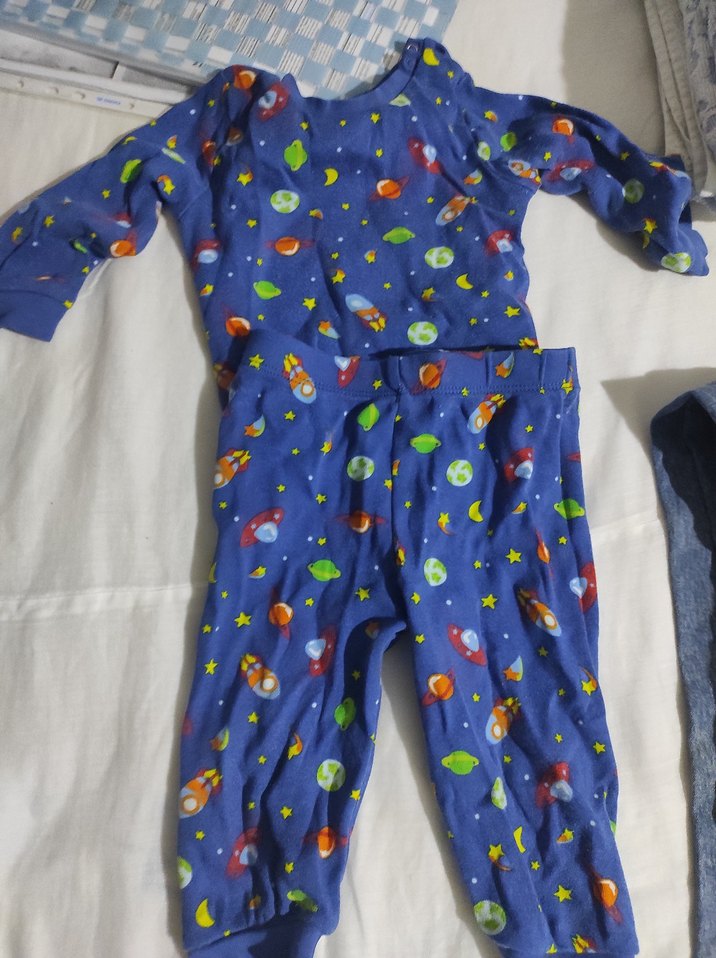 Uzun kollu, düğmeli, mavi ve renkli uzay temalı desenlere sahip erkek çocuk pijaması.