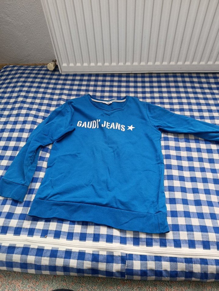 Uzun kollu, bol kesim ve bisiklet yaka mavi denim erkek tişört. Üzerinde parlak baskılı 'GAUDI JEANS' yazısı bulunur, sokak stiline uygun.