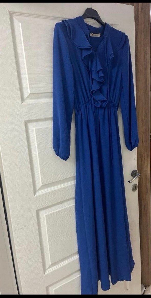 Uzun Kollu Mavi Fırfırlı Uzun Elbise
