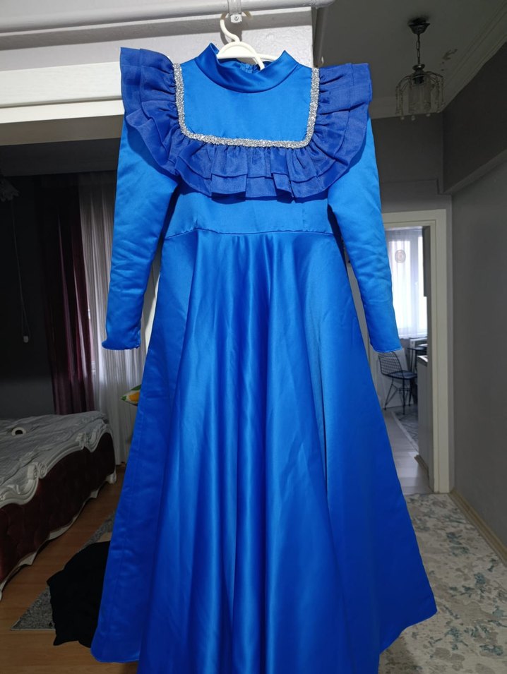 Parlak mavi vintage elbise, yüksek yakalı ve uzun kolludur. Göğüs kısmında fırfır detayları bulunur. Salaş kesim ve uzun boyda, düğünler için uygundur.2 buçuk metre şal kestirmiştim onunla birlikte göndereceğim.