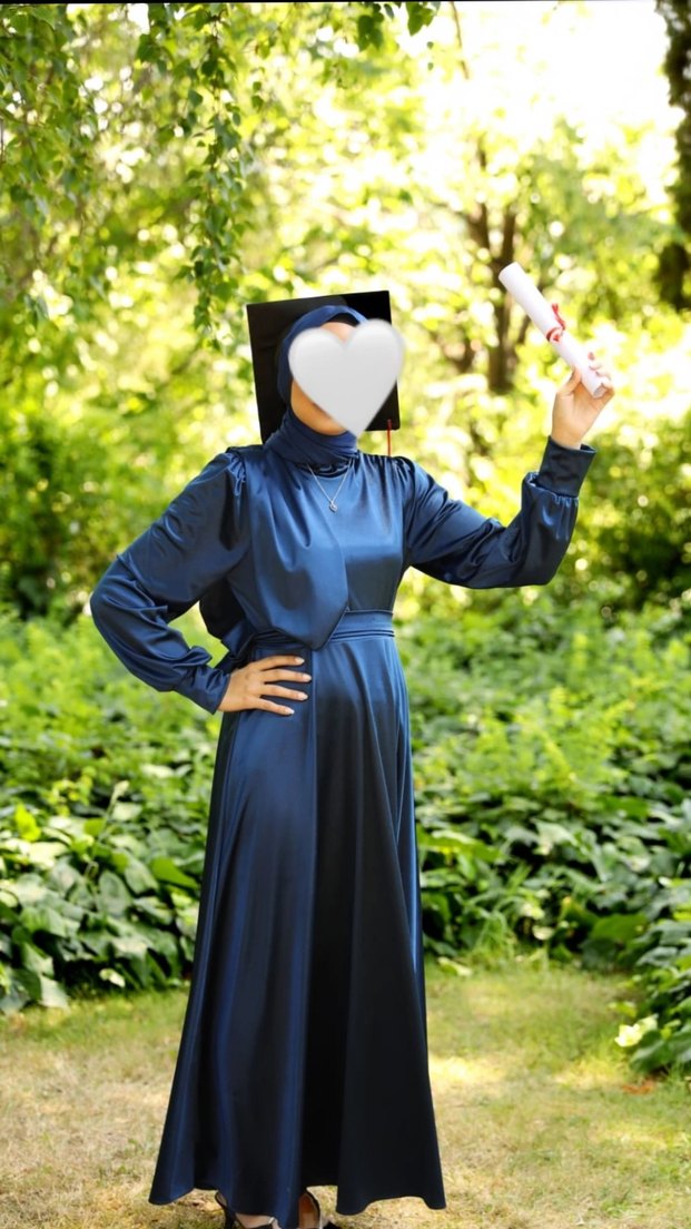 Uzun kollu, yüksek yakalı koyu mavi mezuniyet elbisesi. sadece mezuniyette giydim bir kere ama yıkayınca çok az topaklanma yaptı yanında şalı hediye edicem güncel fiyatı 1700 lira