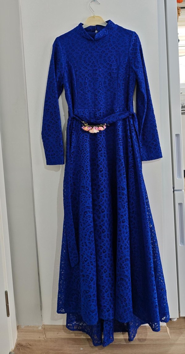 Uzun Kollu Mavi Güpür Desenli Uzun Elbise