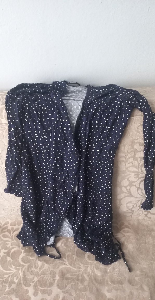 Yumuşak keten kumaştan, düğmeli ve V yakalı, uzun kollu bol kesim hamile bluzu. Günlük rahat kullanıma uygun koyu mavi renk.