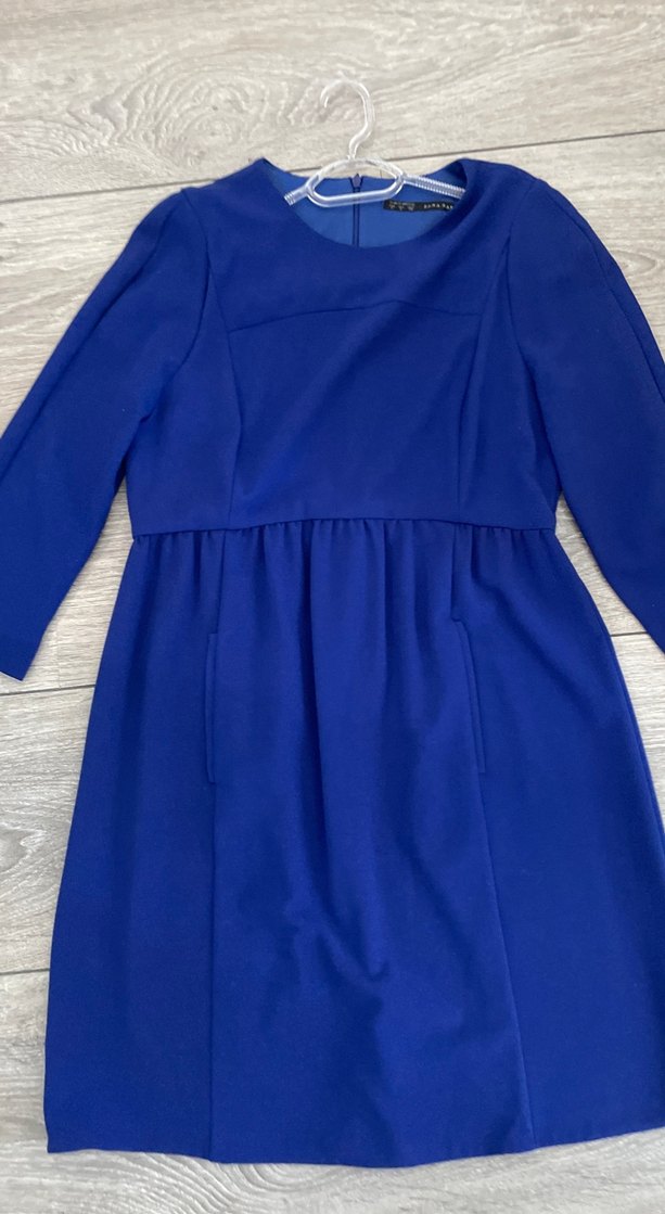 Parlak mavi renkte, yuvarlak yakalı ve uzun kollu bol kesim hamile midi elbise. Drapeli detaylı, ofis için uygun.