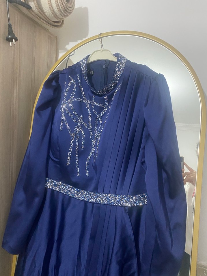 Uzun kollu, yüksek yakalı ve işlemeli detaylara sahip mavi abiye elbise, drapeli ve klasik şıklık sunar. Düğünler için uygundur. ✨