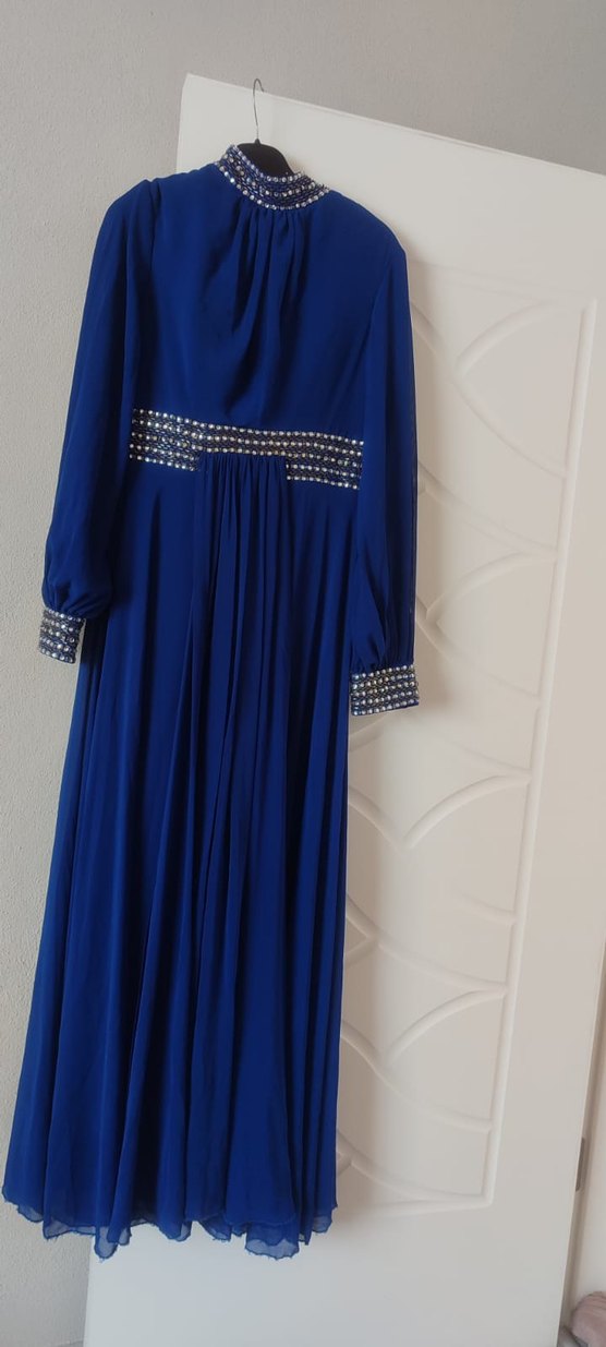Uzun kollu, yüksek yakalı mavi abiye elbise. Salaş kesim, drapeli detaylar ve parlak işlemelerle düğünler için uygundur.