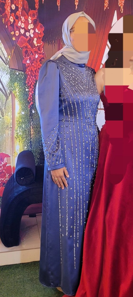 Uzun kollu ve yüksek yakalı mavi abiye elbise, parlak boncuk işlemeleriyle süslenmiştir. Düzenli kesimiyle mütevazı ve şık bir görünüm sunar. taş kısımları yapistirmadir.