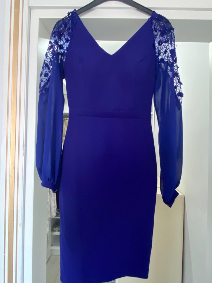 V yaka, uzun kollu ve omuzlarda işlemeli detaylara sahip, drapeli klasik kesim mavi abiye elbise. Düğünler için uygun, şık ve zarif.