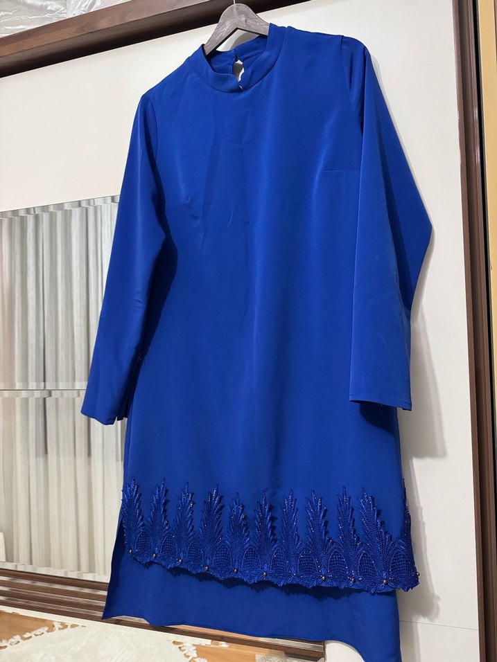Uzun kollu, bisiklet yaka mavi tunik, etek ucunda renkli işlemelerle. Dökümlü, regular fit ve yumuşak sentetik kumaştan, günlük ve sade kullanıma uygun.