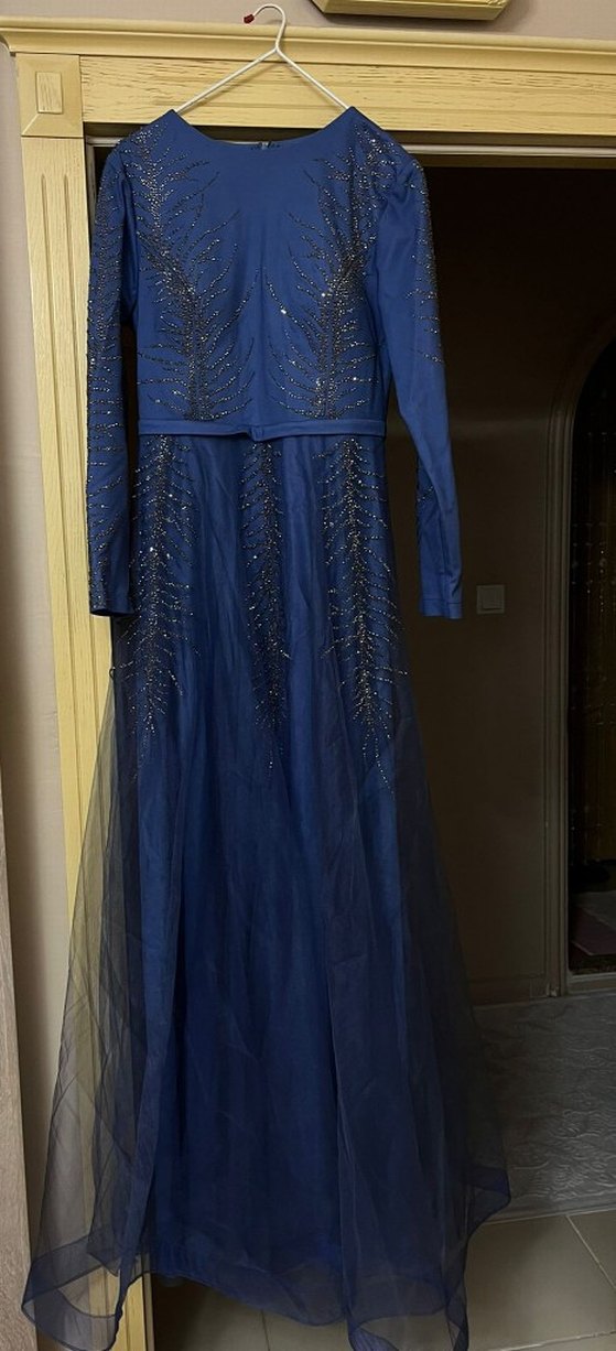 Uzun Kollu Mavi İşlemeli Uzun Abiye