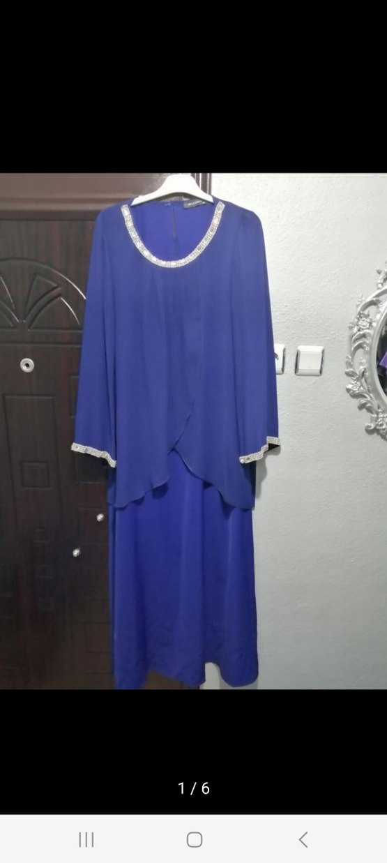 Uzun mavi abiye elbise, bol kesim ve drapeli detaylara sahiptir. Uzun kollu ve yuvarlak yaka olup, parlak süslemelerle sade ve şık bir görünüm sunar. ✨