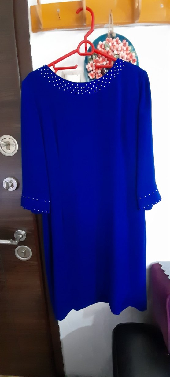 Uzun kollu, mavi renkli abiye elbise, dökümlü ve rahat kesimlidir. Minimalist tarzda, yakası ve manşetlerinde parlak taş detaylar bulunur. günlük te şık olmayi seven hanimlar kullanabilir.sifir urun hic kullanilmadi.✨