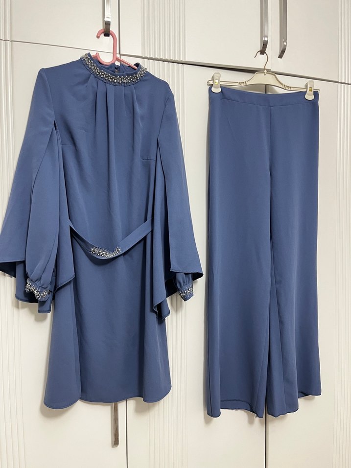 Uzun kollu, yüksek yakalı ve drapeli detaylara sahip mavi kadın abiye elbise üstü, aynı renkte geniş paça pantolonla tamamlanmıştır. Ofis için uygun, minimal ve klasik şıklık sunar.