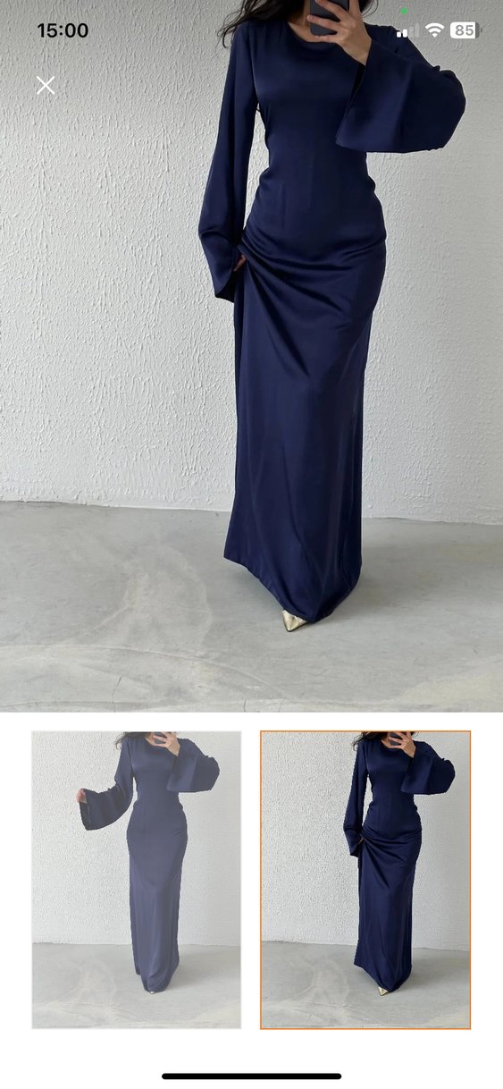 Uzun kollu, koyu mavi elbise, V-yaka ve satenimsi kumaştan drapeli tasarıma sahiptir. Minimalist ve çağdaş stil, günlük kullanıma uygundur. Şalı hediye