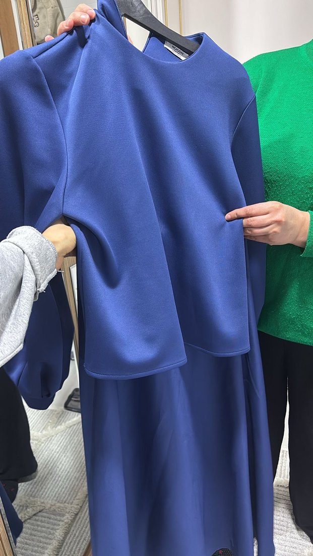 Kadınlar için uzun kollu, bol kesim ve uzun boyda mavi renkte sade ve desensiz elbisedir. Normcore tarzında, athleisure stiline uygundur.