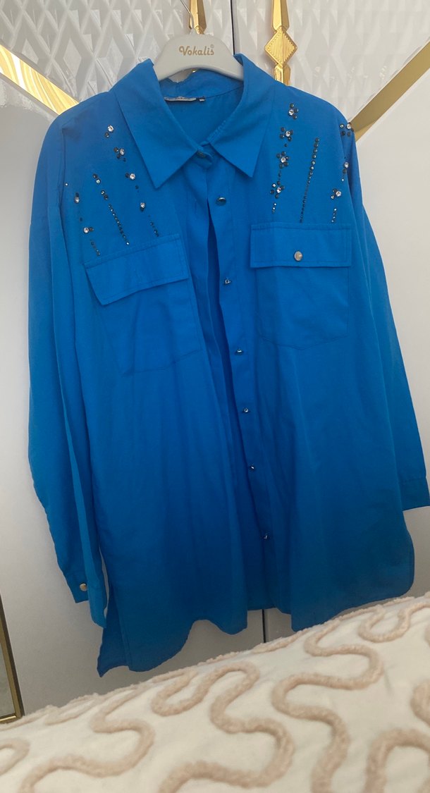 Uzun boylu, parlak mavi renkte, düğmeli ve yakalı kadın gömleği. Rahat kesim ve uzun kollu, yumuşak sentetik kumaştan, günlük sokak stili için uygun. ✨