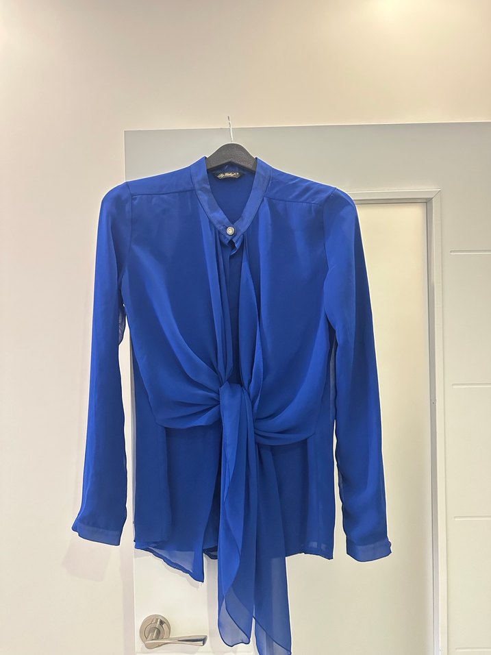 Mavi uzun kollu gömlek bluz .Şifonumsu kumaş ve astarıyla, önden bağlama detayıyla çok şık. 1 kez giyildi. Marka temsili