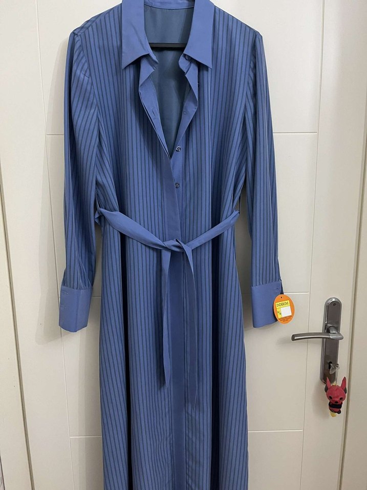 Uzun kollu, regular fit mavi kadın gömlek elbisesi, iş tarzında normcore ve ince çizgili desenlidir. Belden bağlamalıdır.