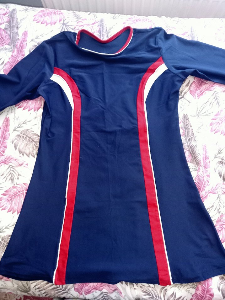 Uzun kollu, mavi kırmızı renkli haşema. Kırmızı ve beyaz renk bloklu detaylar sportif kırmızı taytıyla birlikte yollanacak 38, 40 bedene rahat olur.