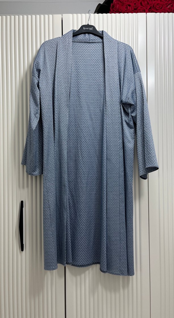Kadın sabahlık, uzun kollu ve bol kesimdir. Mavi renkli, dokulu yumuşak kumaştan yapılmıştır. Uzun boyu ve desensiz tasarımı vardır. ️
