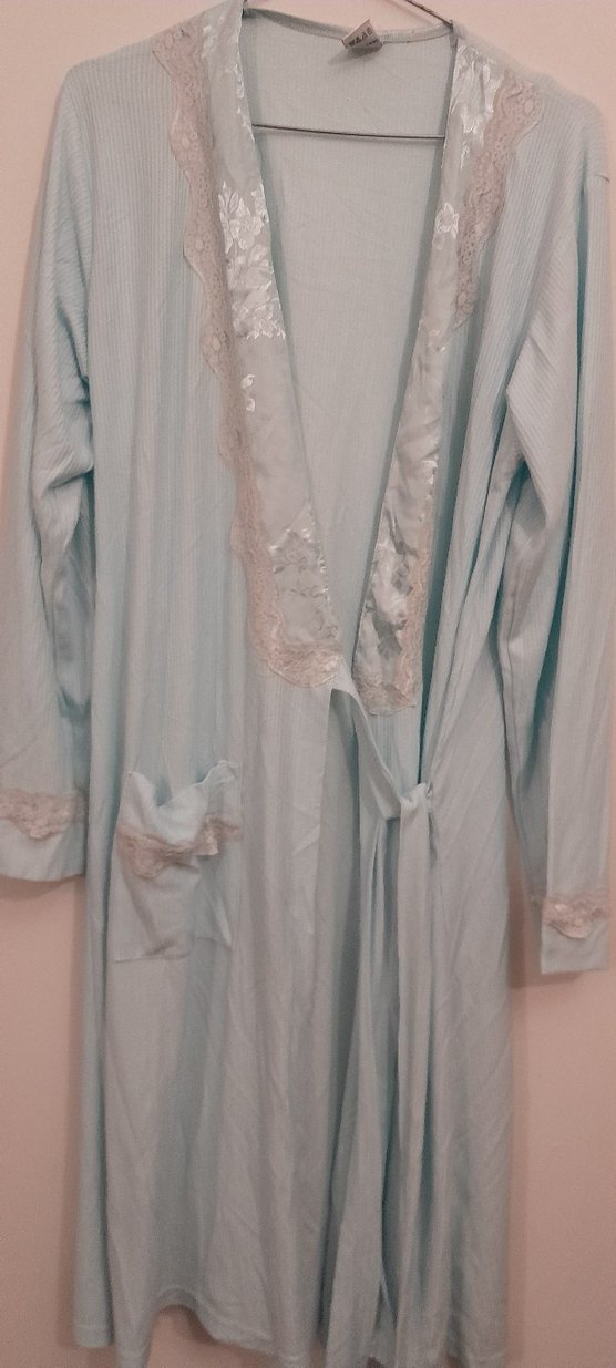 Uzun kollu, bol kesim mavi kadın sabahlık. Dantel detayları ve bağlama kemeri bulunur, rahat ve klasik bir tarz sunar. ️
