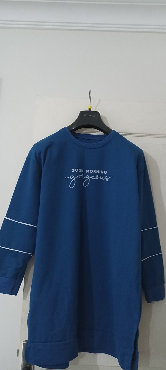 Uzun kollu, yuvarlak yakalı mavi sweatshirt, yumuşak ve sıcak kumaştan yapılmıştır. Bol kesim ve "GOOD MORNING gorgeous" baskısı ile rahat bir stil sunar. ✨