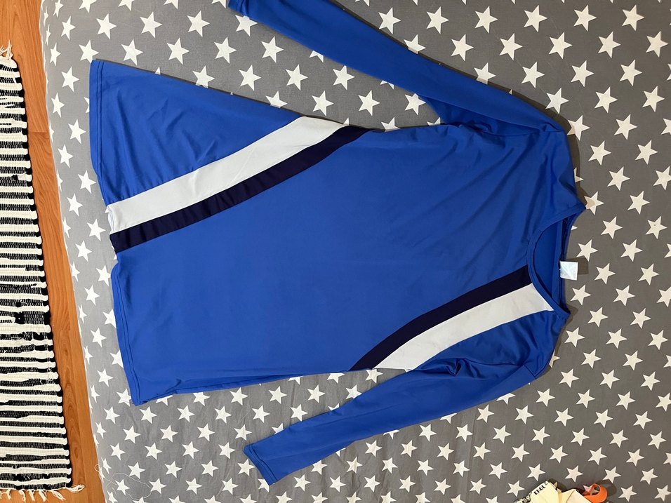 Uzun kollu, drapeli ve fitted kesime sahip erkek mayosu. Mavi renk, beyaz ve koyu mavi çapraz şeritlerle spor ve athleisure için uygundur.
