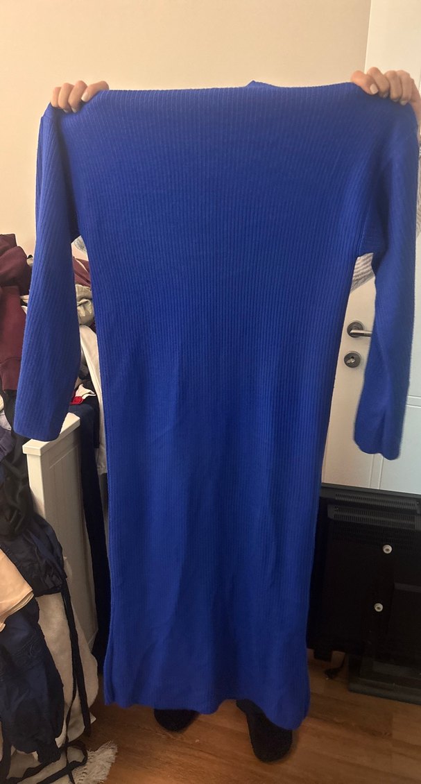 Dar kesim, uzun kollu, yuvarlak yaka mavi kadın triko elbise. Sentetik kumaştan, rahat ve sokak modasına uygun, günlük kullanıma uygun.
