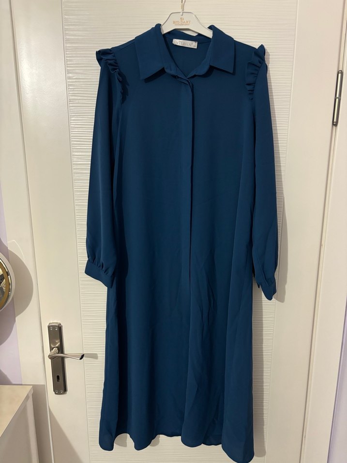 Uzun boy mavi tunik, yakalı ve omuzlarda fırfır detaylıdır. Rahat kesim, uzun kollu ve düz renklidir. Ofis için uygun, minimalist tarzda.
